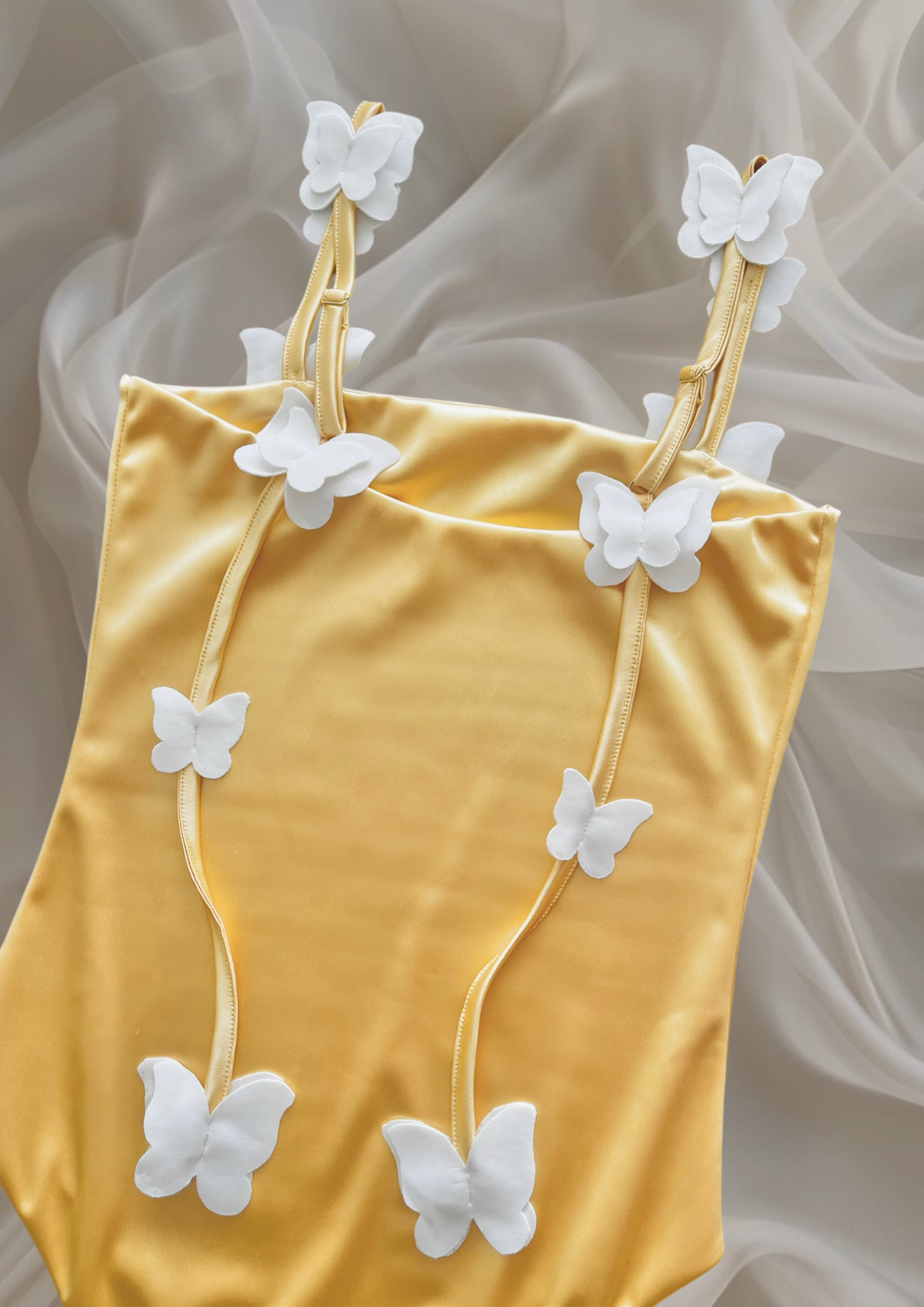 La enredadera de mariposas que recorre la silueta desde los hombros hasta la cintura, hace que esta pieza sea completamente única.
