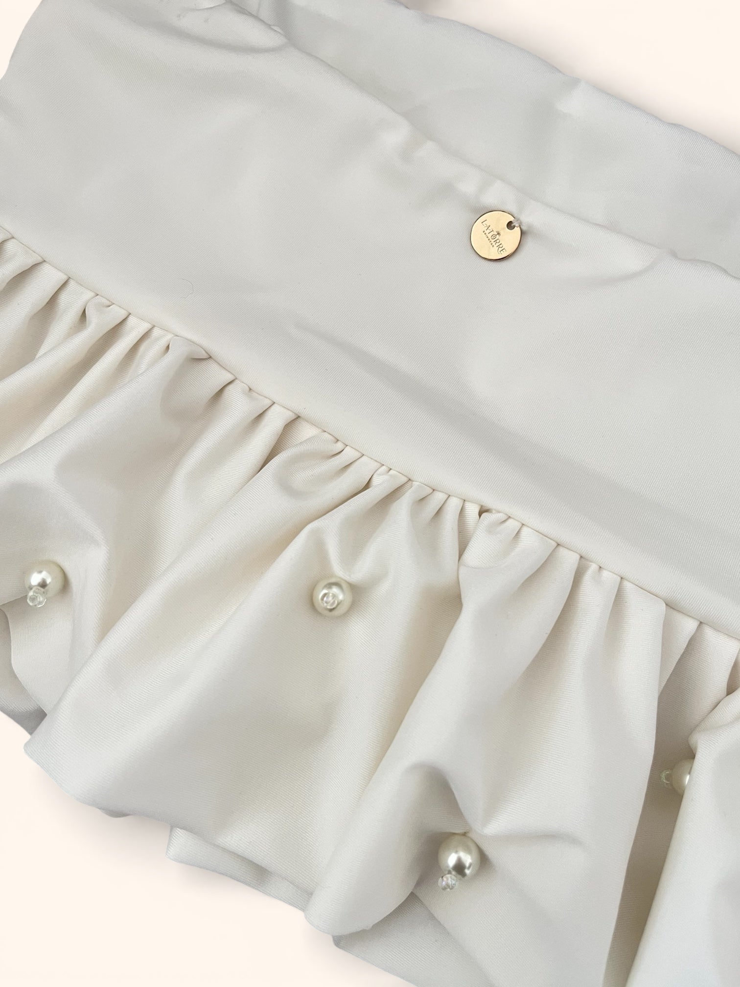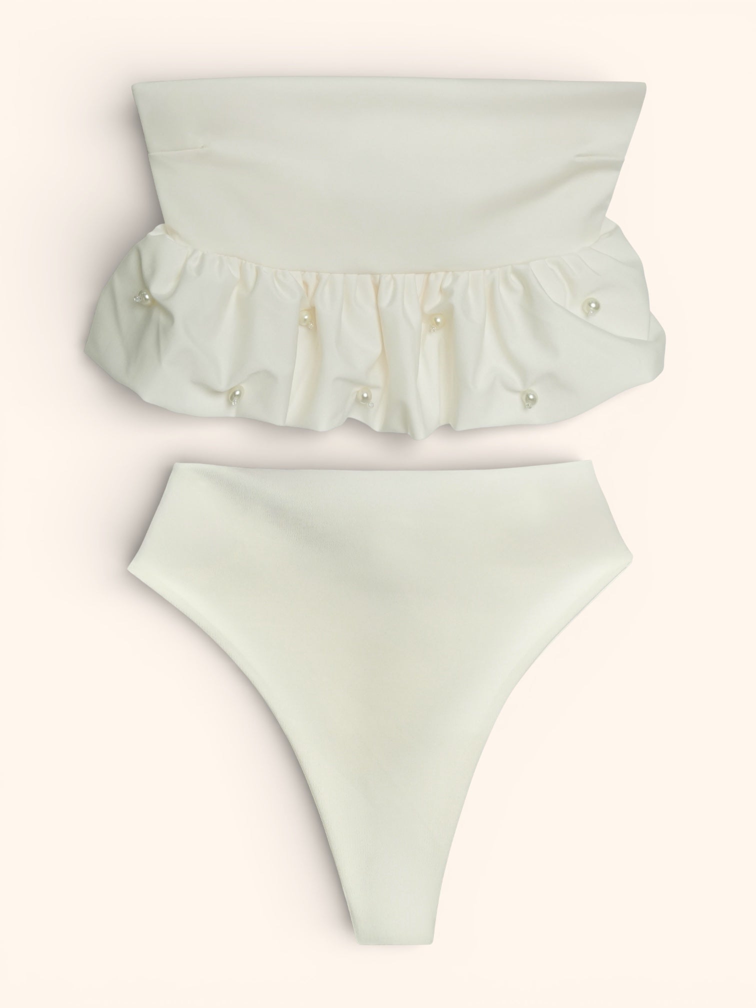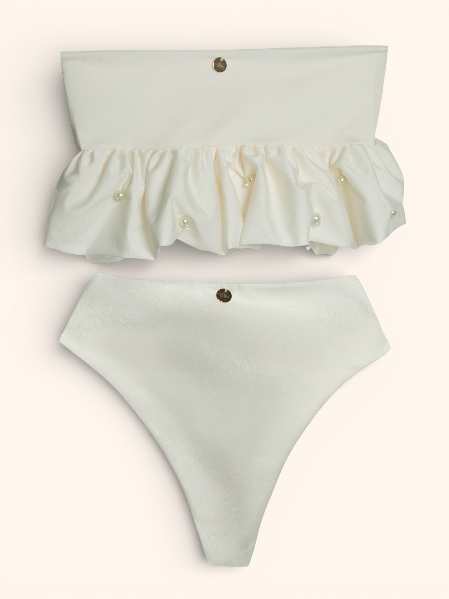 El Bikini talle alto FEMME combina elegancia y carácter en un diseño único. Su croptop estilo peplum, adornado con delicadas perlas pegadas a mano, lo convierte en una pieza versátil y llena de estilo, perfecta para destacar dentro y fuera de la playa.