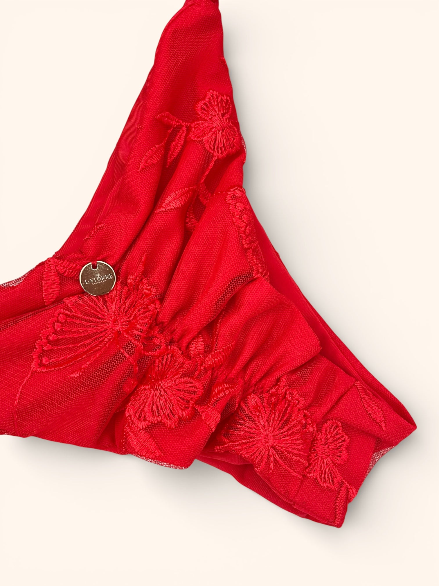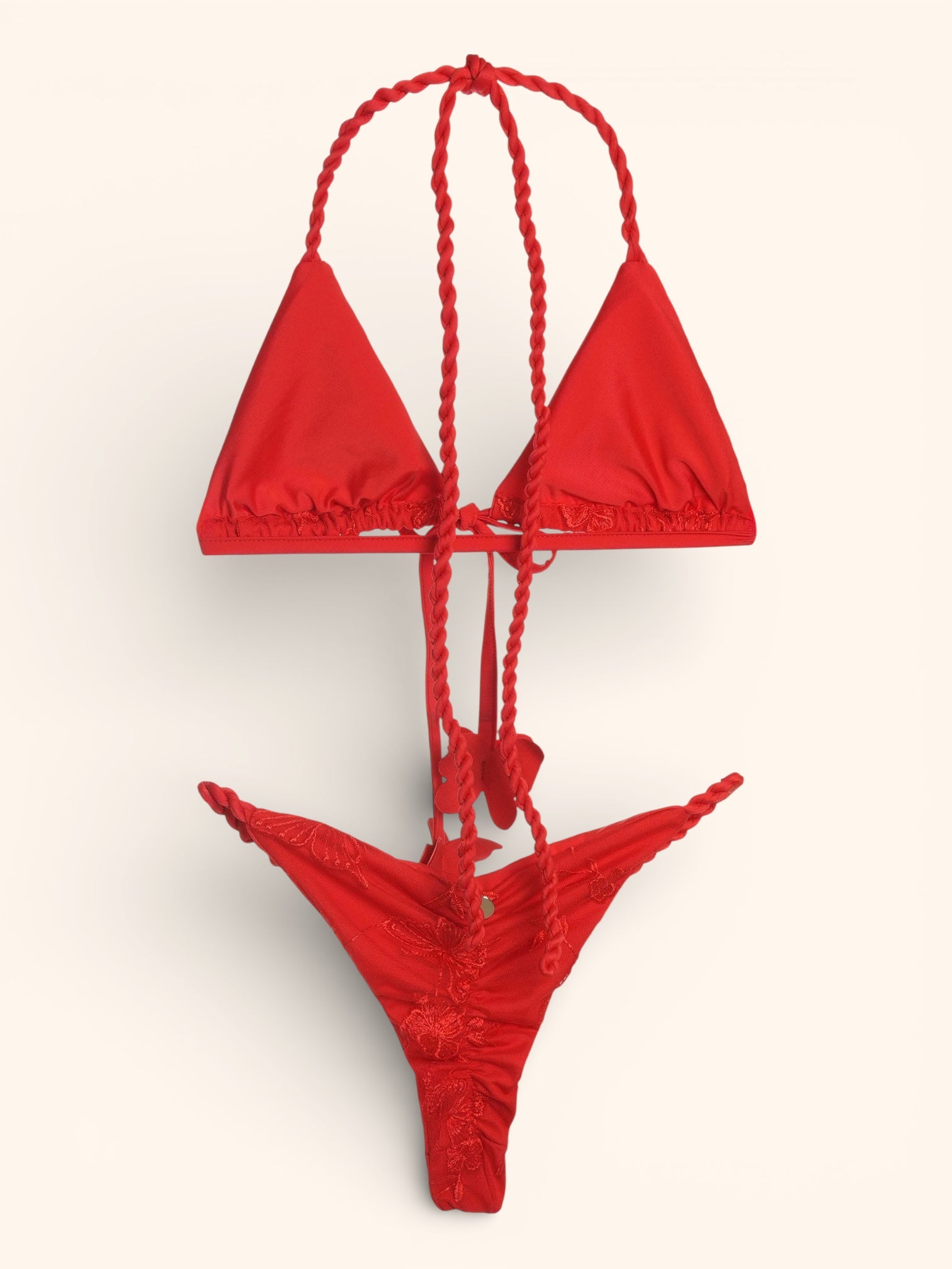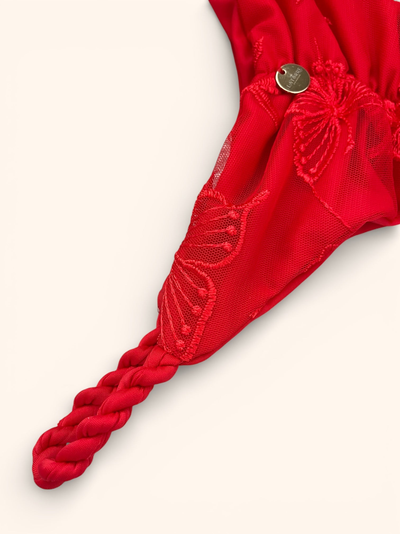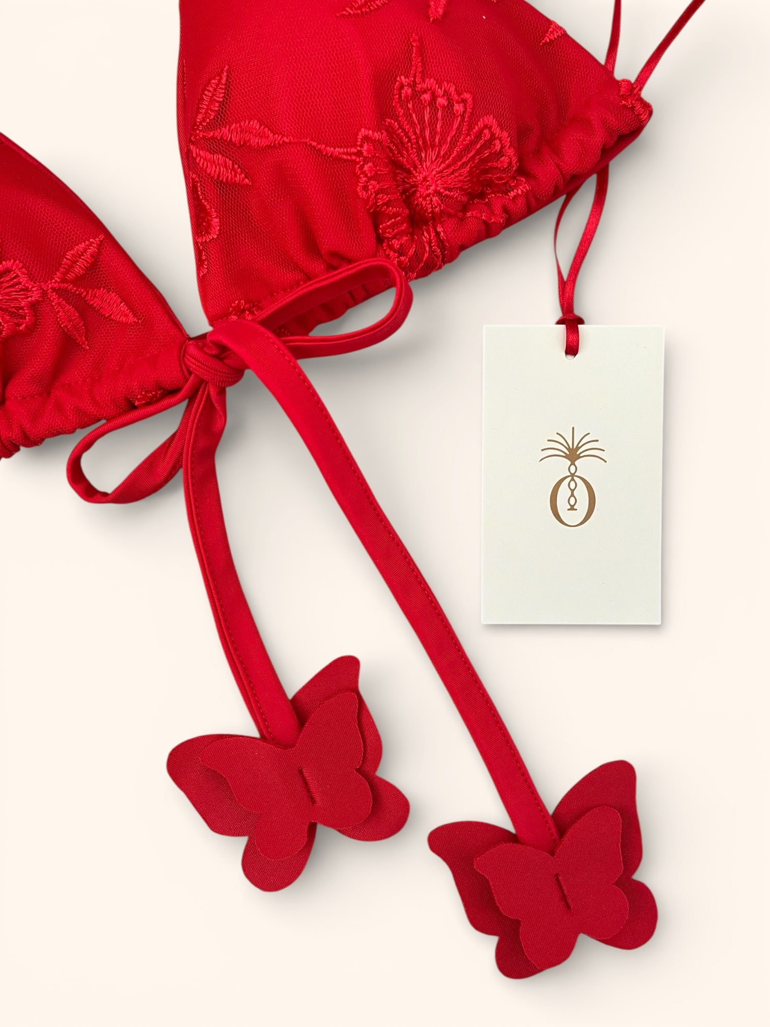 Nuestro bikini BISOU es un diseño triangular que resalta la delicadeza y el detalle en cada elemento. Su base textil en chantilly bordado aporta una textura sutil y romántica, pequeñas mariposas elaboradas a mano que lo hacen verdaderamente especial.