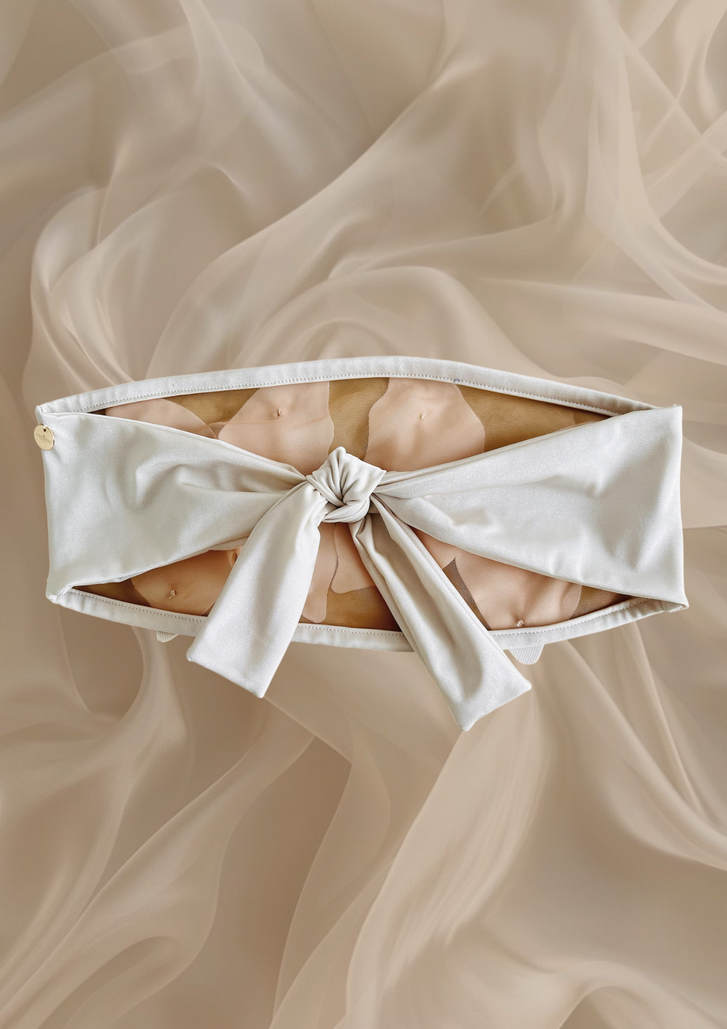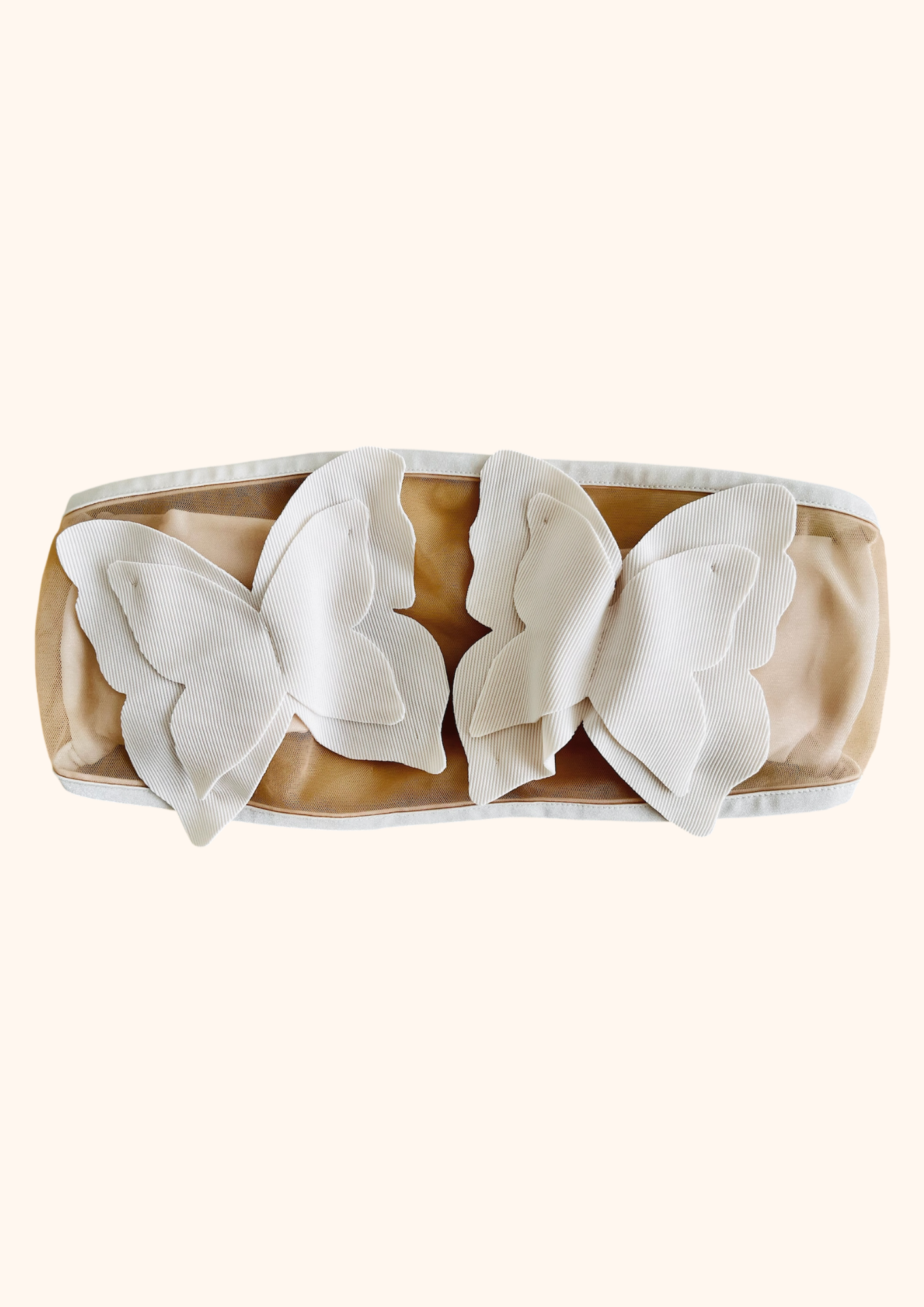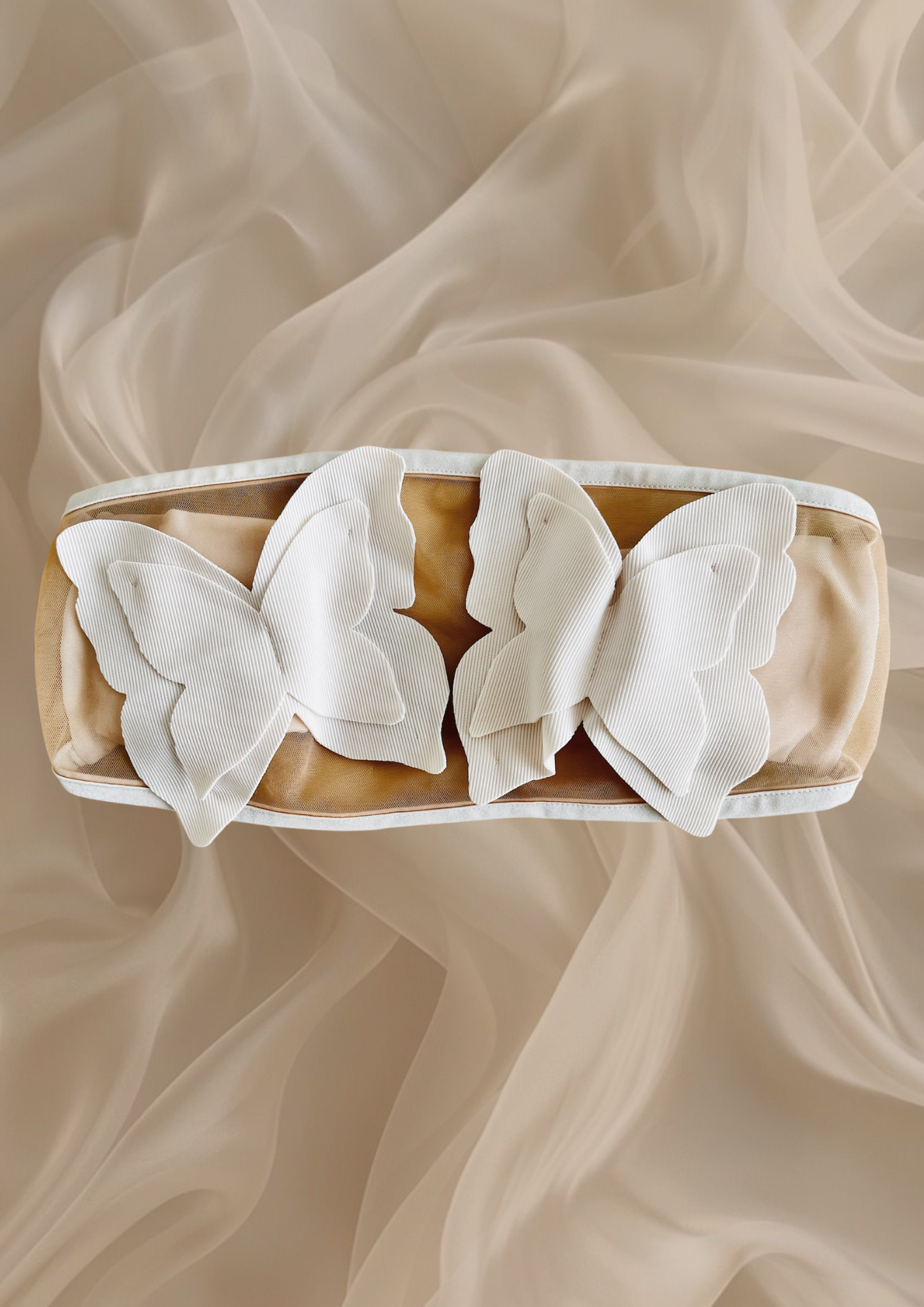 El top MISS se caracteriza por su diseño sin tirantes, con un sutil tejido de malla que resalta dos mariposas perfectamente ubicadas, dando un toque delicado y audaz.